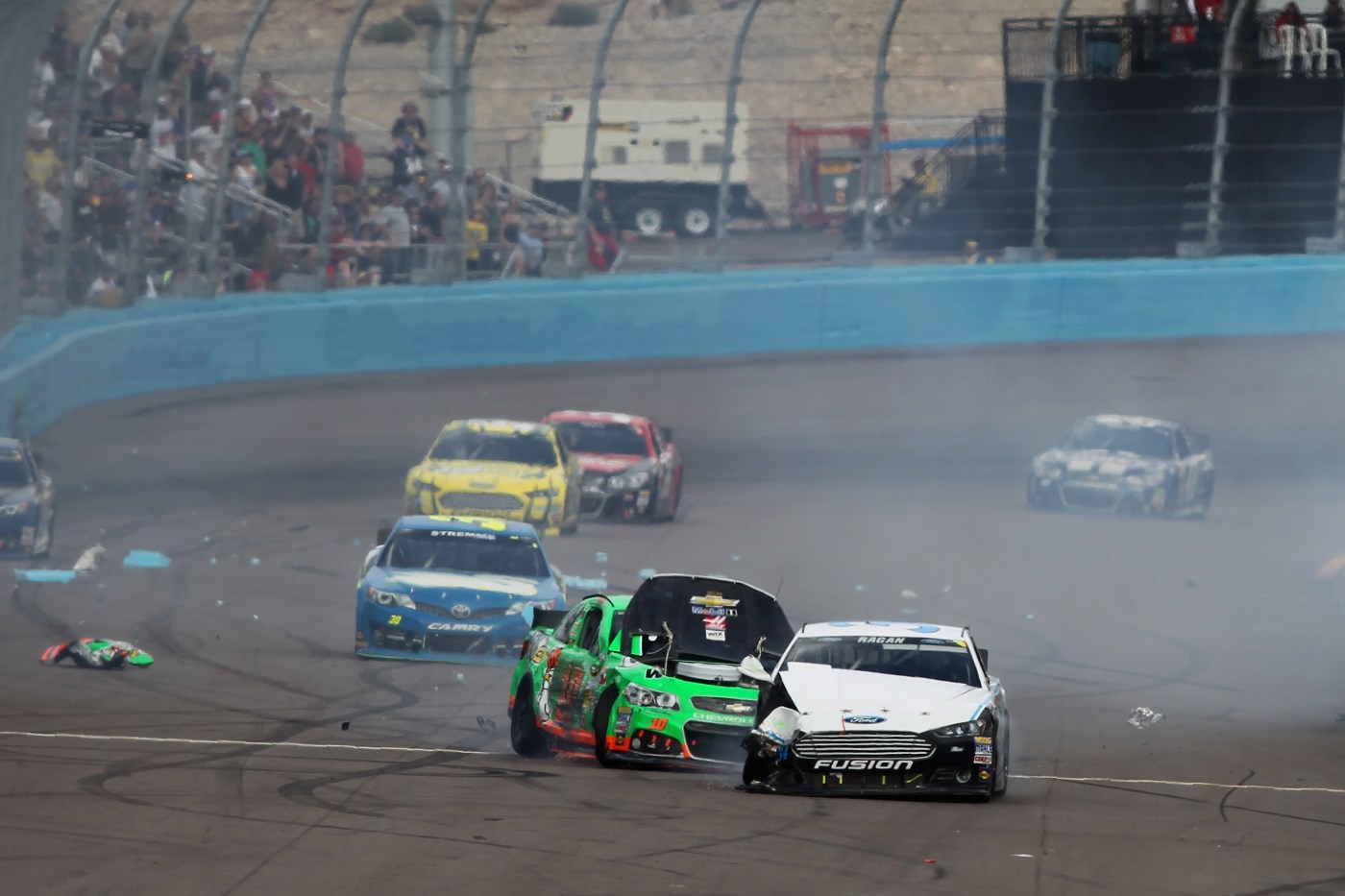 In the race, Danica managed to stay on the lead lap, assisted by caution periods when other drivers crashed out, and she ran as high as 21st at one point. But ultimately her right-front tyre let her down, failing on the exit of turn four and sending her into the outside wall, before rebounding into the path of David Ragan who could not avoid a collision. The race was over immediately for Patrick, but Ragan managed two more laps before retiring.